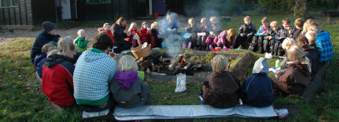 Når vi kommer til skoven, starter vi vores tur med at spise frugtmadpakker. Vi deler os for det meste i mindre grupper og tager på ture ud i terrænet. Her har vi vores faste baser rundt om i skoven og ved stranden - udvalgte steder, hvor børn og voksne specielt godt kan lide at være. Nogle gange har de voksne planlagt en aktivitet, som for eksempel at lede efter svampe eller insekter. Andre gange udforskes skoven på børnenes præmisser med os som nysgerrige voksne.